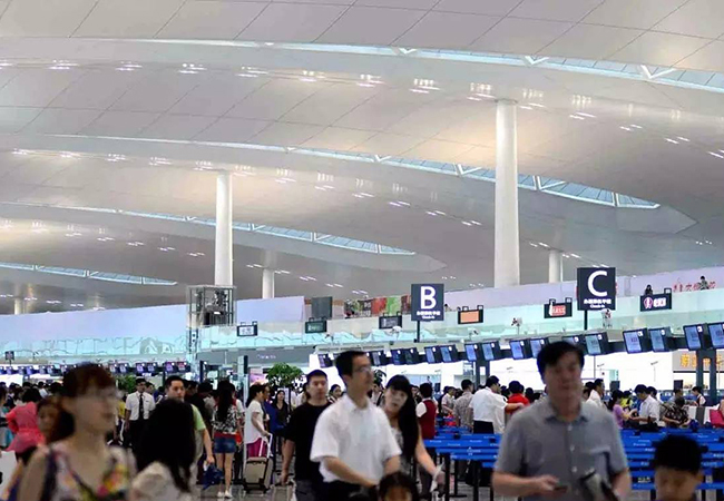 正午12点,室外气温升至36℃,机坪上突破50℃,但在候机大厅内,没有感觉到一丝暑热和刺眼的阳光。禄口机场航站区管理部物业管理科科长吕海峰指着侧面和顶面的遮阳帘说:“574块遮阳帘拉下后,也能给航站楼降温。同时,楼内有274块气动窗,可以随时开启,对室内进行换气通风和调节温度。再加上楼顶8507平方米的绿化,整栋大楼如同加了保温罩,并且可随时呼吸。”