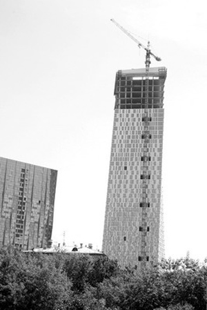 日前,俄罗斯“共青团真理报”又爆出一条新闻:位于莫斯科电影制片厂路的高层建筑(见图)也是违章建筑。这个建筑还没有完工,便因金融危机停工。该建筑有70层高,是莫斯科新时期著名的摩天大楼,远远望去,非常显眼,非常独特,完全可以成为标志性建筑,尽管关于它的风格有许多不同意见。在这个建筑的高层可以欣赏莫斯科所有主要的景观:高尔夫俱乐部的湖泊、莫斯科大学的森林公园、俯首山胜利公园的喷泉、新修女院教堂的金顶、莫斯科河畔的风光、莫斯科市中心的宏伟建筑群……