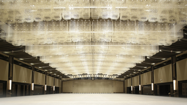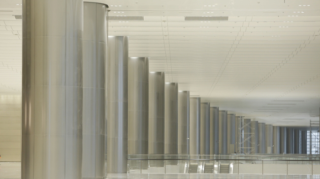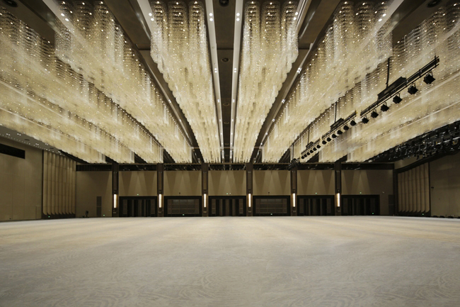 多功能厅是改造项目中最大的一个单体空间,东西长49.2米,南北长64.7米,面积3185平方米。铜飘带面积共计730平方米,规格尺寸为56000毫米×1000毫米,工程量巨大。