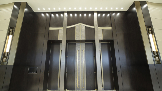 高3.6米、宽2.36米的多功能厅防火门以纯铜为主要材质,每扇门重达1.2吨,相当于24个普通实木门的重量,这样的超大防火门国内极少。项目组第一次面对这么大、这么重的门,如何安装成了摆在面前的难题。