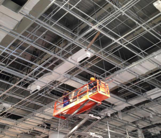 经与业主及设计方多次研究讨论,项目组决定采用铝板逆作法安装方案。该技术通过多个工程实际应用,有效解决了大空间吊顶系统的施工不便等问题,技术实用,具有良好的推广价值。该技术具有施工简单方便、速度快、施工连续性强的特点,省去了传统脚手架的搭设,降低了措施费投入和工程造价,并大大减少了同区域交叉作业的影响,施工便捷,缩短了工期。最终,工程顺利完工,实现了预期设计效果,获得了业主方的高度认可。