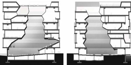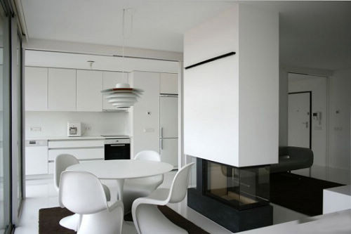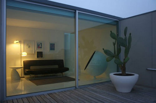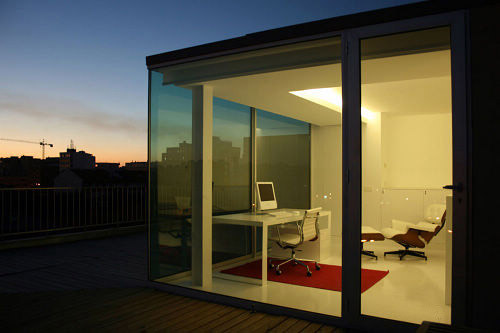 设计师在保持原有建筑外形不变的基础上,将其改建成为一座居民楼。通过剪和向后移动,透过玻璃窗户可以看到公寓的一部分。