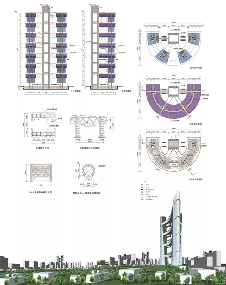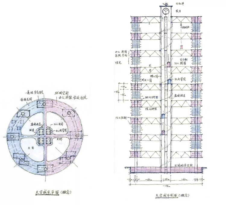 笔者设想的天空城镇平面及剖面构想图