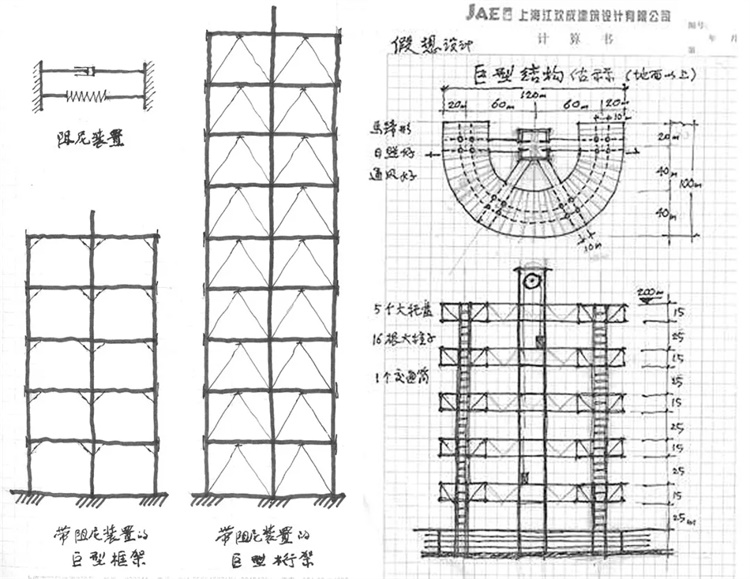 由于高层建筑物的大部分核心筒被省去而集中成为一个垂直的交通核,每一栋高层建筑的刚度明显减弱。所以,该建筑群的结构体系必须是巨型结构,由大柱子和大平台组成,它可以是巨大型框架,也可以是巨型桁架,如果加上阻尼装置就更好了。作为巨型结构,平台桁架的支撑不可滑动,由温度变化引起的内力可以计算出来。温度应力不会很大,因为柱的刚度不是很大。该巨型结构的高度与宽度的比例不大,因此整体稳定性不成问题。
