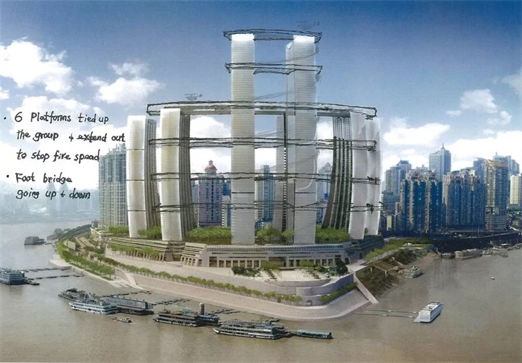 我想对设计师Safdie Moshe先生表示祝贺,他在即将迈入80岁高龄之际,仍出色地完成了重庆来福士广场项目。和Moshe先生同龄的我,想借他的方案为例以呈现我的想法。具体见下图: