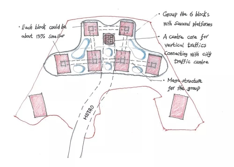 具体做法如下:减少电梯数量,减小所有建筑物核心筒的占用面积,并在这些建筑物之间建立交通核。所有机电楼层均用大平台连接在一起,同时与交通核相连。交通核中的每个大电梯可以容纳50人以上,也可以与不同尺寸的电梯组合,就像公共汽车和小巴士一样。这些电梯只在平台上停靠,平台上只允许行人或小型电瓶车行使。平台上的多层建筑使用少量小型电梯进行微循环。这样每个高层建筑的楼面面积就会减小些,譬如减少15%。总平面稍觉宽松些,使用效率得到提高,房间朝向也会好。
