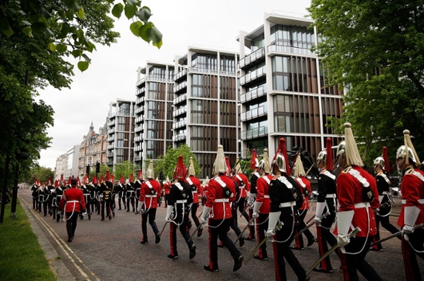 皇家骑兵(Household Cavalry)列队通过伦敦的海德公园1号(One Hyde Park)豪华公寓