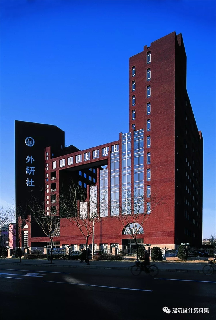 黄 | 就我的观察,1997年北京外国语教学与研究出版社大楼建成,此项目您沿着一条“符号—隐喻与体量关系”的路线,在满足功能需求前提下,将多余的面积从中间减掉,形成巨大洞口,高低错落的墙体与方形框架暗示着书与书架,砖红的色彩呈现突显的建筑体量,从洞口隐约看见内部空间层次的延伸与变化,这个项目您表现得更朴实无华,去除繁琐与花哨,偏向暗示的表述,所以不管是阿房宫凯悦酒店的“官帽”或是屋顶的暗示,还是到外国语教学与研究出版社大楼书与书架的暗示,其实您在设计上的操作保持着一致性,符号暗示语言也都比较多,也比较直接,而且允许相当程度的装饰及象征,色彩也趋近于统一,这部分您的看法如何?