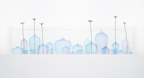 水母花瓶这一系列作品是关于用不同眼光看问题的。它是关于如果水不在花瓶里,如果花瓶浸泡在水和花朵里会怎样。然后我们开始研究材料,做了很多试验。花了大约两年的时间研究作品的厚度,硬度以及液体的流动。它并不是一个完整的最终作品,但是它传递给人们的是用新的眼光看待事物的思想,是一种新的想法。