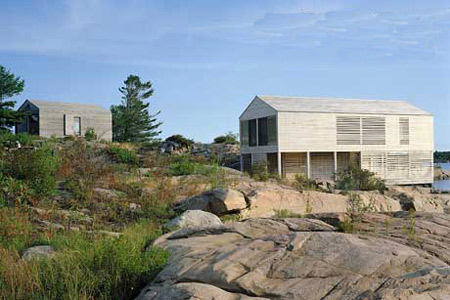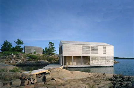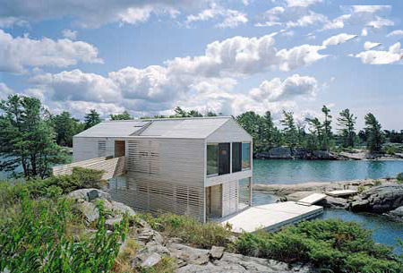 Floating House是一间漂浮在休伦湖(Huron lake,北美五大湖中第二大湖)上的房子。房子的底部却有多个空心浮筒,让它能漂浮在水面上。为了让房子能在水面上变得平稳,设计师给便房子设计了船锚。外形上和一般的民用房子没多大区别的Floating House,实际上是由两个部分接合而成。这样的设计能便于主人改变房子的漂浮形态和靠岸的地点,从而实现了“移屋换景”。