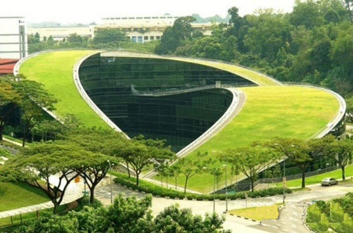 现在我们看到绿色屋顶作为一种方法,将建筑建造在本不应该建造的区域之上。Kenzo Tange设计了新加坡南洋科技大学的总体规划方案,他们称这个方案为一个“花园式校园”,因为Kenzo Tange将花园设计在校园的中间位置,成为了校园的“绿肺”。那么中间的艺术,设计和媒体的新的学院被称为什么呢?