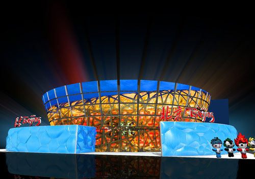 走出电子祥云彩门,“中国风”、“奥林匹克风”等几件雕塑展品造型奇特,在灯光的映衬下,显得格外炫目。场馆负责人说,这两件展品,和北京奥运会徽“中国印”玉雕、汉皇方鼎是北京馆的镇馆之宝。