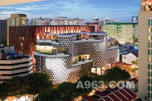 虽然在造型上是当代风格,但这栋建筑的规模及采用的材质与周边建筑极其协调。彩色的线性元素使人回忆起色彩明亮的公共住宅区,而极具装饰感的曲线形建筑立面对变化多端的体块,细致的纹理以及历史遗留下来的店屋那生机勃勃却又杂乱细致的装饰做了全新的诠释。