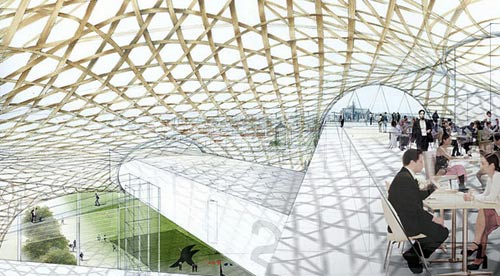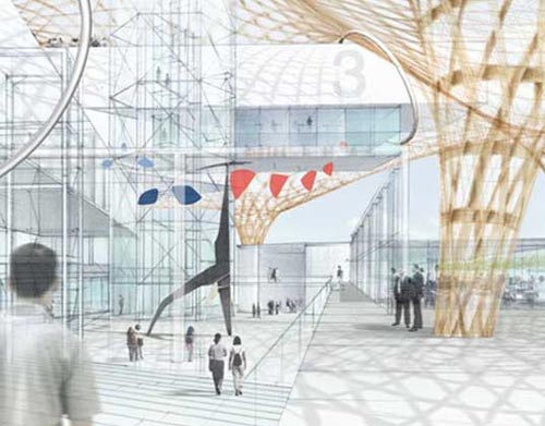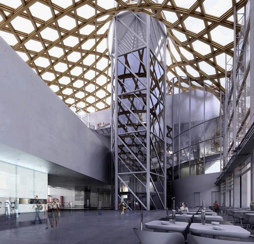 3座高100米、宽15米的钢构长方形管道结构可以控制气温,适合放置永久性的展品,如年代久远的火车站和教堂纪念物。下面是暂时性展览的区域,包括室内和室外两块区域,安装了可移动的玻璃窗板,能够自由开关,与周围的公园环境配合使用。