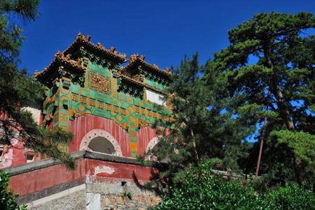 昭庙门东向,穿过月河上石桥,迎面高台为一座四柱三间七楼,长二十七米五彩三门琉璃牌楼,汉白玉石基座和券门,琉璃砖瓦的枋柱和枋顶,雕刻着彩色龙纹图案。琉璃牌坊在昭庙前的石台上,由黄绿两色琉璃瓦装饰而成,显得庄严华美。牌坊上题“法源演庆”、“慧照腾辉”等匾额。其后由大白台、清净法智殿、井字形重檐御碑亭、大红台、都罡正殿、七层万寿琉璃塔组成。