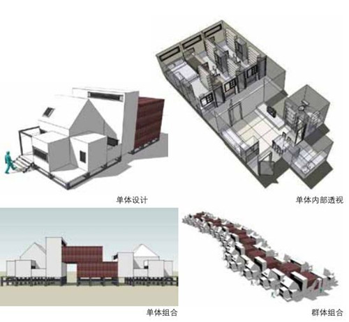 集装箱到了灾区以后,里面的东西被使用了,集装箱本身则闲置下来,那么这些集装箱是否可以利用起来?首先,集装箱尺寸为3.6m×5.4m,较为符合房间的尺寸;第二,材料为金属,把边缘加固并使用保温隔热的材料,就可以变成长久的居所;第三,集装箱可以两头打开,解决了通风问题;第四,对集装箱的再利用,可以减少废弃物对环境的破坏。基于这种思路,我们对集装箱住宅进行了探讨和概念设计。