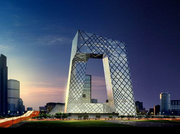 中央电视台新台址主楼位于北京市朝阳区中央商务区(CBD)核心地带,主楼高234米,由裙楼、两个塔楼和悬臂结构组成。两个塔楼从一个共同的平台升起,在162米高空大跨度外伸,形成相交对接。该方案是由雷姆·库哈斯和奥勒·舍仁担任主建筑师,由荷兰大都会建筑事务所(OMA)负责设计。