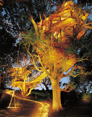 另一处精密的考量就是楼梯。我决定不去搭建直达树屋的楼梯,它只会抹杀树干的雄壮之美,因此我决定借鉴毛伊岛海滩俱乐部——从邻近树屋延伸出桥,直接延展到美丽海滩前的大沙丘上。我也不愿意在树屋内搭建标准的楼梯。唯一的楼梯被精心地镶嵌在主干之中。将一级台阶嵌入树干会耗费5天的时间, 由于不使用任何钉子, 一年后随着树的生长它就自然成为大树的一部分。这些精雕细琢在美国几乎是见不到的, 它需要的工艺只有极具艺术领悟力的雕刻家才能完成。