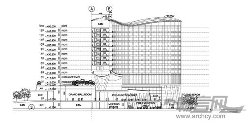该项目是一座五星级度假酒店及相关配套设施,配备440个客房和2座别墅。总建筑面积77323平方米,地上12层地下2层,建筑高度50米,地下部分采用钢筋混凝土结构地上部分为钢结构。