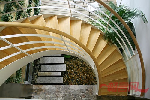 为了鼓励集团员工在与楼上和楼下的公司联系时多使用楼梯,建筑师特意在走火梯和空中花园的隔墙上开了几个圆窗,让员工在使用楼梯的时候,能看到室外变化的光线下不同的园艺景致。