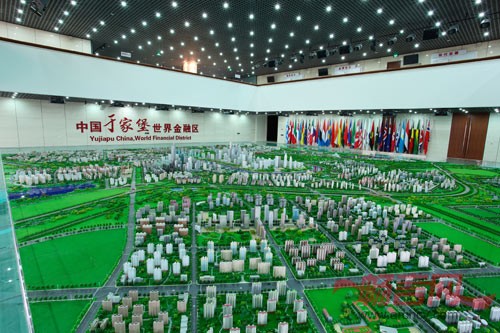 一楼沙盘展厅沙盘区整体抬高50厘米,周边暗藏蓝色LED光源,突出了沙盘区域。沙盘展厅北面护栏边设计将立体影像投射其中。展厅采用各种光学与声学科技手段,多角度的展示了一个正在崛起的于家堡金融区形象。