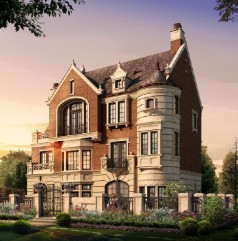 本小区立面以英伦风格特征为宗旨,强调建筑体积感,时代感和创新性。建筑立面处理强调文化与个性,运用光与影来塑造建筑形象,充分利用材料的质感与肌理及