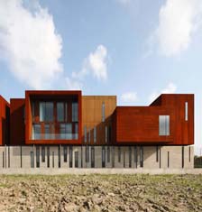 建筑的形态完全是对基地环境的回应,建筑功能里特殊的一些房间如会议室等以特别的形态从建筑方形的体量中游离出来,呈现朝向北侧风景的态势。