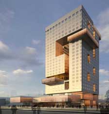 作为酒店在建筑设计上的另一大特色,便是其独特的功能流线。宾客由主入口进入酒店后,先是乘坐四台高速电梯直达31层的空中大堂,办理好入住手续后转乘其