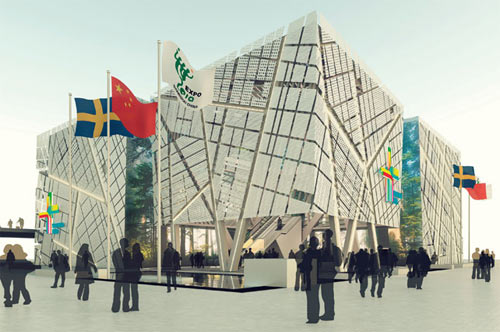 瑞典馆位于世博园C 区,临近欧洲展区的其它北欧国家馆,占地3000 平方米。展馆共三层,由四个方形建筑连接组成。从高处鸟瞰,瑞典馆的建筑就如同瑞