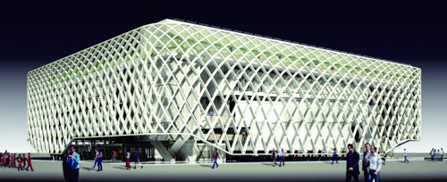 漂浮在水上的白色宫殿,如镜的水面倒映着白色网格状的外墙。从屋顶到墙面,错落有致的绿色植物成片蜿蜒,形成一个巨大的露天垂直法式园林。水韵荡漾中,法