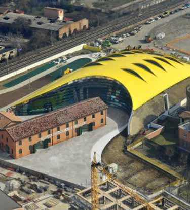 法拉利博物馆是座黄色的流线型建筑,其铝屋顶带有10个切口,这刚好契合汽车发动机的出风口——利于通风和采光,两者共同之处是都反映了汽车设计的美学。