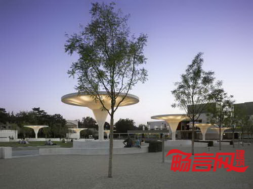 Georg-Buechner广场位于德国Darmstadt的Hessian州立剧场旁。开敞的阶梯式中央区域,带有一条条草坪绿化带,充当了剧场的前