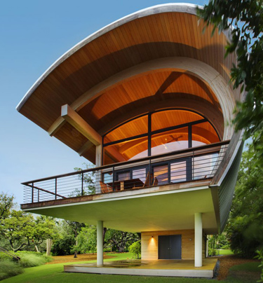 从巴西的里约热内卢驾车出发,行驶大约1小时,就到达了该市的Angra dos Reis地区。那里有一座依山傍水的别墅,别墅的树叶形状的屋顶是它最