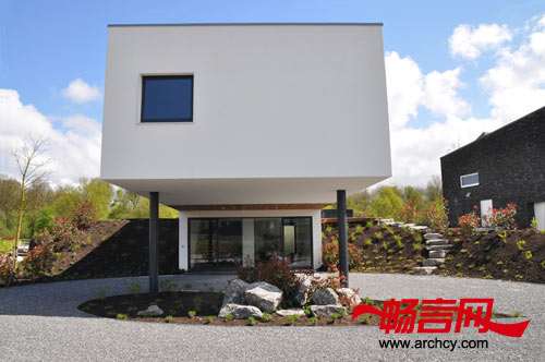 因为在建筑地块上出现了一座小山包,所以,住宅的大部分房间都建在了空中:一座三层高的矩形建筑将设有一间起居室、一间厨房和一间卧室。在空中房屋下面有
