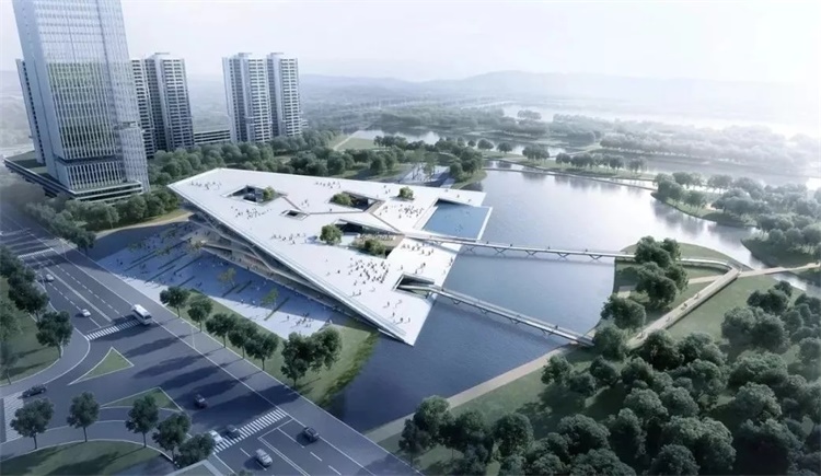 苏州高新区文体中心位于苏州科技城内,背靠小龙山,被太湖大道和浒光运河所环抱,占地三百余亩,馆室十七万方。其所处的地块曾是采石场,挖掘后留下的巨大