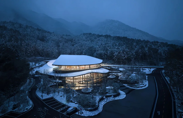 江西大鲵文创体验中心位于江西省靖安县——九岭山脉脚下,群山环抱,自然景观优渥的一处微坡场地。体验中心的创作灵感来源于两只合抱的大鲵在自然环境中畅