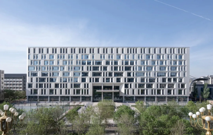 教师教育实训中心位于太原师范学院晋中新校区中轴线最北端,图书馆北侧,北大门南侧,西侧为学生宿舍区,东侧为运动场看台。为多功能复合的校园综合体建筑