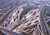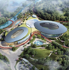 本项目独创性的将室内足球馆、室内篮羽馆、室内冰场、温泉康体功能与休闲商业结合于一体,形成国内首创的体育综合体建筑。建筑坐落于公园内,室内功能与室