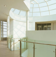 现状建筑内部缺乏公共空间,且通风采光条件差,室内空间缺乏品质。改造中首先将中庭打造为景观中庭,成为建筑核心景观空间,配合顶部可开启窗扇,改善建筑
