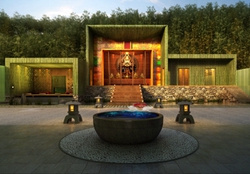 竹亭中,居舍里,与簌簌风声作伴,进入空灵禅修之境,身心放松,木鱼声似乎响起在内心身处。庵堂及附属服务空间位于中心,客房以散落布局方式分列两侧。