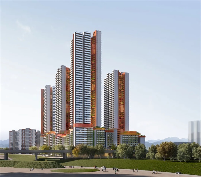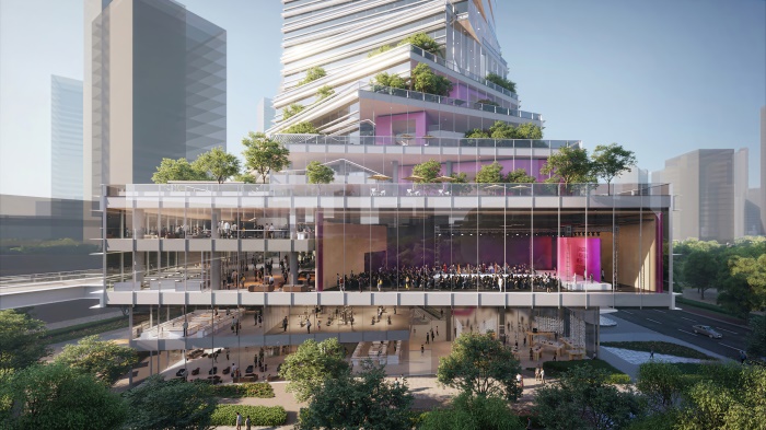 方案以“园上公社”为概念,从场地周边绿地环绕的现状格局为出发点,将同乐公园的绿意延伸到场地内,在首层形成一个面向城市的全天候开放的底层“公园”。
