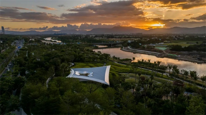 “驿站”近年来常用来指代景区或公园内让人在游玩中驻足的小建筑,它可以承载咖啡、休憩、艺术展览、文化活动等功能。海棠晓翼就是这样的一座驿站。它是华
