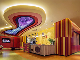 柚米乐儿童教育中心以“天真活泼”为主题,整个空间大面积地使用红色与黄色,形成鲜明的色彩碰撞,透明玻璃上形态各异的卡通涂鸦元素,既满足了孩子对任何