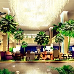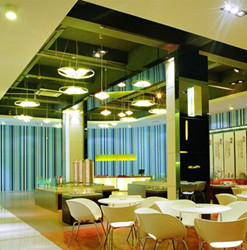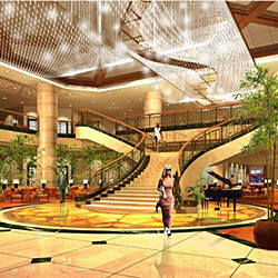 中庭是王府井大酒店的重心,改造中我们在中庭里做了一个很漂亮的通向二层的楼梯,把中庭分割成了两个空间。而这两个空间与楼梯后的空间三者形成了一个丰富