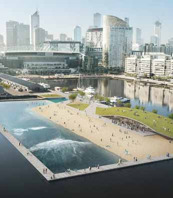 墨尔本冲浪者未来可以在加热咸水池内跃上1.5米高的浪尖。墨尔本漂浮冲浪池方案由Damian Roger建筑事务所和奥雅纳工程公司共同完成。冲浪池