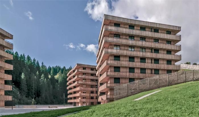 本项目三栋住宅楼依托地景,打造了一个人与自然紧密相连的舞台。社区中心建筑的体量强势介入场地,在尺度上又保持克制,并且把原有的连桥整合到结构与功能