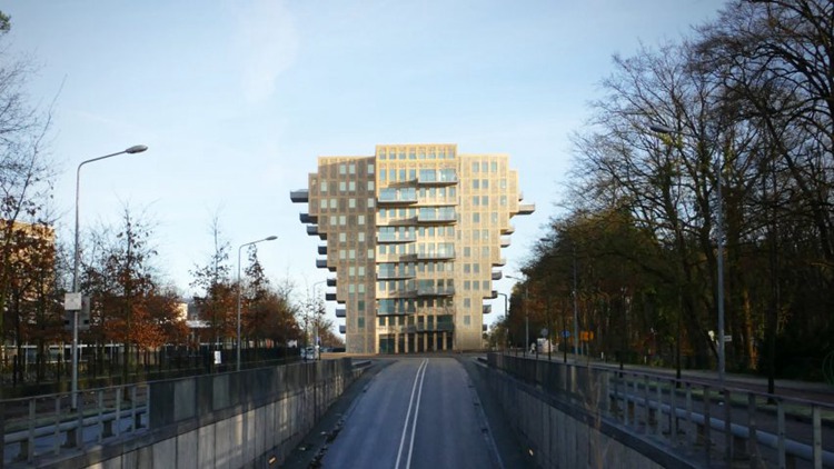荷兰建筑师Rene Van Zuuk完成了Hilversum的公寓楼设计。这是一座十字形建筑,呈现出“头重脚轻”的格局,高楼层的住宅单元要低于低