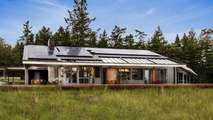 这座557㎡的住宅坐落于华盛顿州圣胡安岛的山坡上,由三个建筑体量组成。建筑群面向格里芬湾(Griffin Bay),拥有非凡的海景视野,主要由两