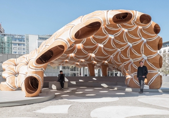 德国斯图加特大学的运算化设计学院(ICD)和建筑结构与结构设计学院(ITKE)合作完成了一座新亭子的设计和制作,展现了壳状木片的自动化纺织加工工