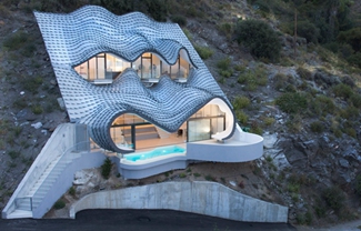 不寻常的结构主要体现在构造杂乱的屋顶上,其由许多块锌瓦片铺设而成,并且使用了可变形的金属网,这样屋顶结构就可以贴合手工打造的框架。设计师介绍,从